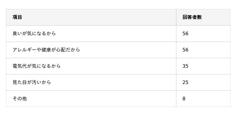・エアコン掃除の動機は「臭いが気になる」「アレルギー・健康への心配」が大部分で、掃除していないエアコンを使い続けるのは9割以上が不安感を覚えている。