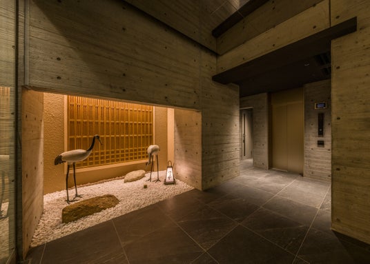 料亭「つる中」の文化的価値を現代の住まいに敷衍(ふえん)することを意識しながら設計しました。10階建ての建物を2-3層毎に分節して低層の料亭街の都市スケールをモジュールとし、古来より日本の美の象徴とされ建築にも用いられてきた大和比による壁面構成で、風格を受け継いでいます。都心の高密度な環境において“開きつつ穏やかに応答する”ファサードは、プライバシーを確保しながら室内へ光・風を取り込み、まちとの良質な関係を築いています。来客を迎える低く深い庇や、住まいへ至る動線、空間に配置された古美術はもてなしの情緒を醸し出します。前室や坪庭の構成、外部から隔てられた静謐で快適な内部空間など、住まうことでじんわりと豊かさを感じられるように料亭固有の空間哲学をRC集合住宅へ再構築し、凛とした品位のある都市居住空間を創出しました。