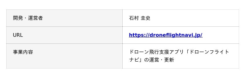 「ドローンフライトナビ」は、航空法および小型無人機等飛行禁止法に基づき、人口集中地区・空港周辺・送電線の位置・緊急用務空域・日出日没時刻などをリアルタイムに表示するドローン飛行支援アプリです。iOS・Android・Webに対応し、月間アクティブユーザー約3万人を有する国内有数の飛行支援ツールです。2017年のサービス開始以来、法改正への対応を継続し、操縦者の安全飛行を支え続けています。
