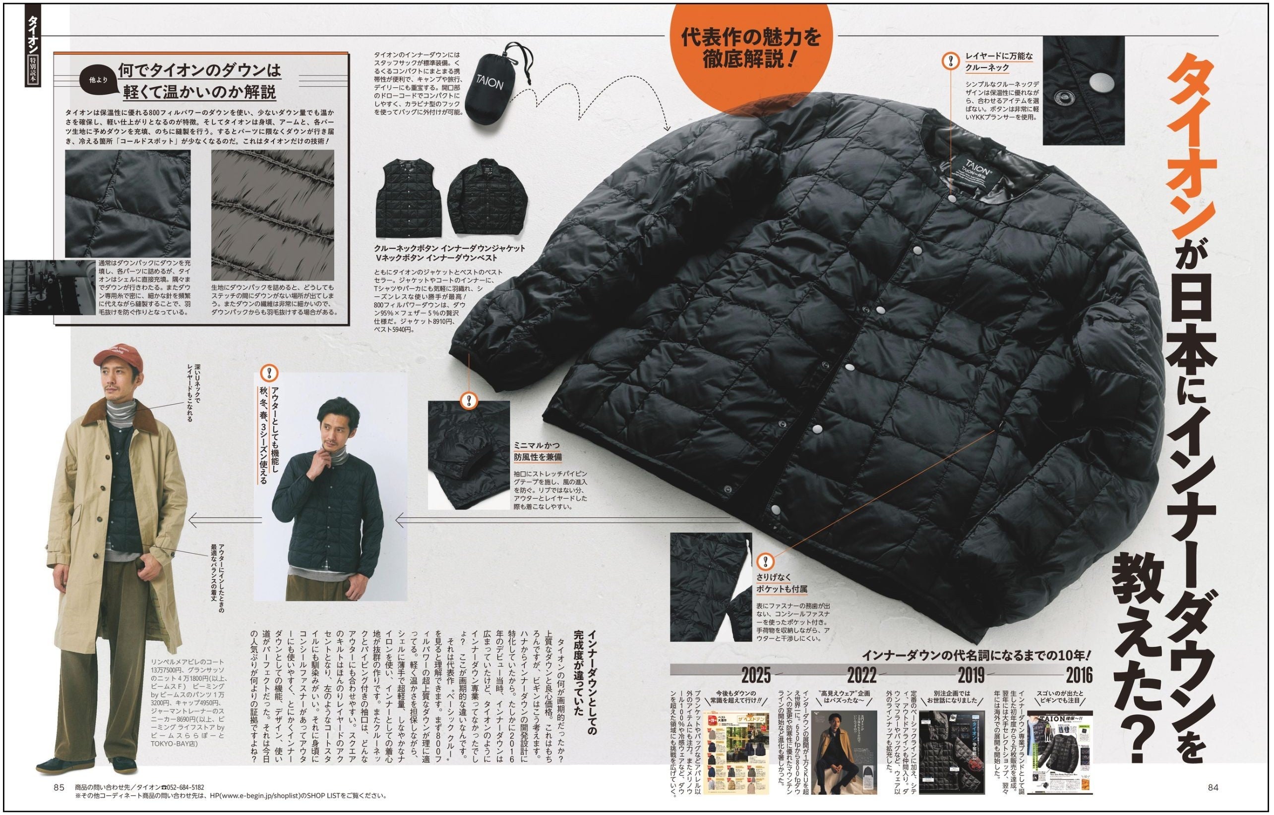 10月16日 (木) 発売のBegin12月号では、「10年後も着続けたい服」を紹介する第1特集に加え、堅実なモノ作りでツウからの信頼も厚いインナーダウンの雄「TAION」の10周年を祝した企画も!