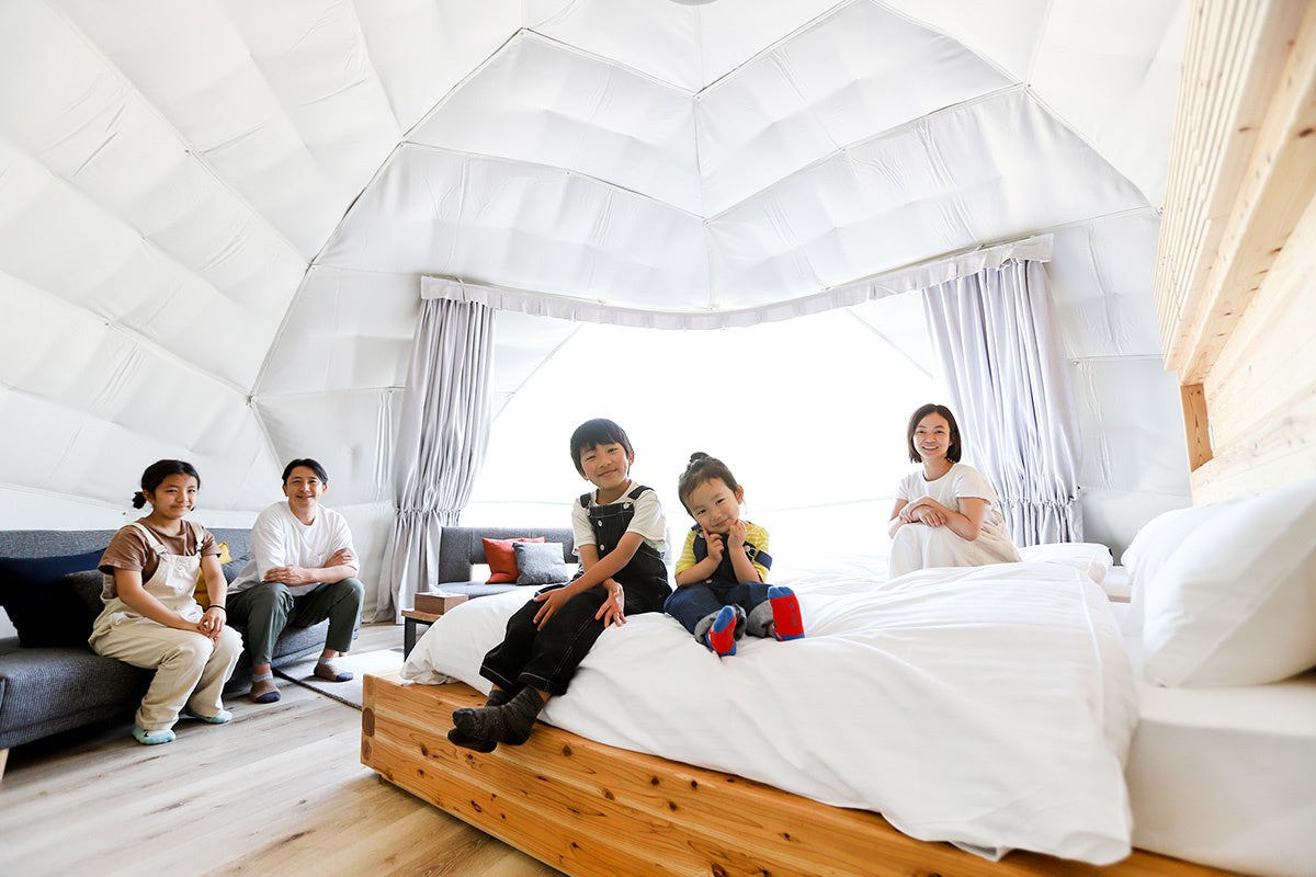 那須の雄大な自然に囲まれたグランピング施設。広々とした直径7mのドームテントには、シャワー、トイレ、洗面台、冷暖房を完備。夕食、朝食は那須の食材をふんだんに使用したお料理をご提供いたします。無料アクティビティも充実しており、非日常と贅沢な時間をお過ごしいただけます。