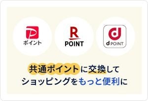 みずほポイントは、共通ポイントである「PayPayポイント」「楽天ポイント」「dポイント」の3つ全てと「1ポイント=1円相当」で等価交換することができます。これは国内銀行初(※2)のサービスです。