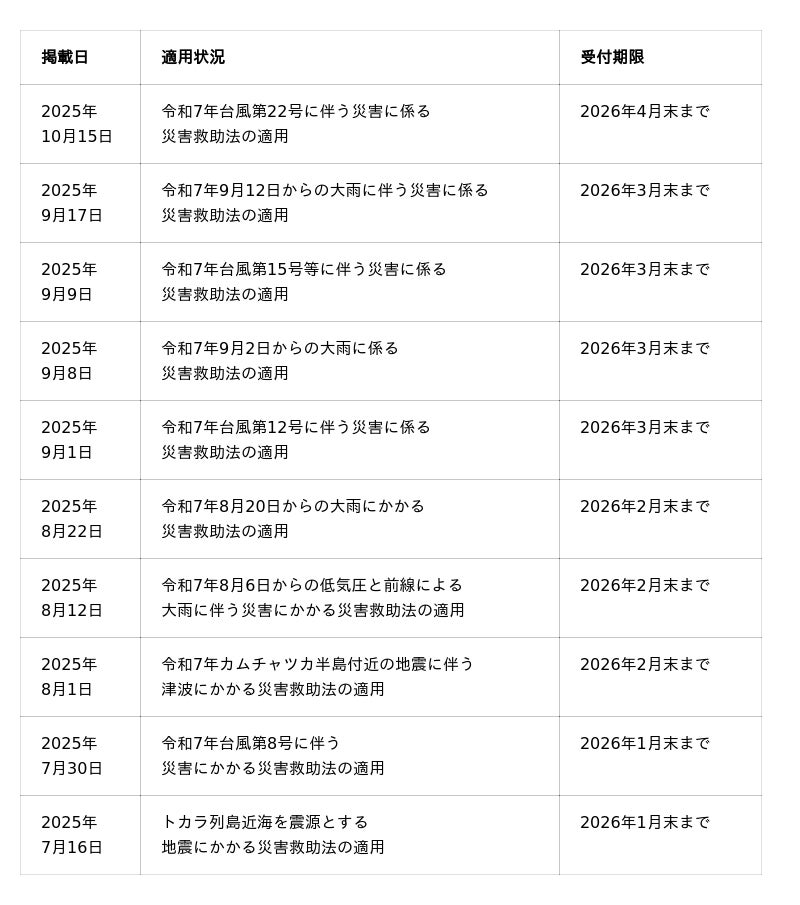 ※災害救助法適用地域の最新情報は内閣府のホームページにてご確認ください。