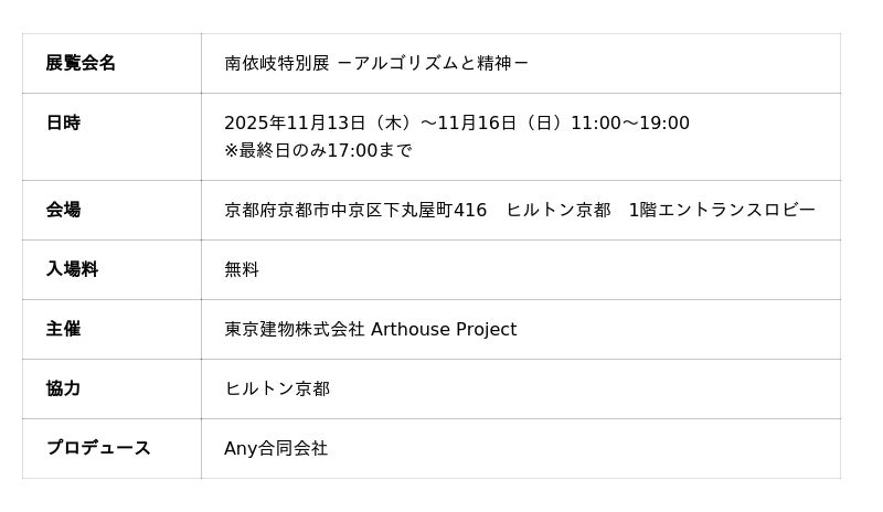 東京建物株式会社は、多様なプレーヤーとのコラボレーションを通じて、都市空間におけるアートの新たな価値の発見を目指す実験的取り組み「Arthouse Project」(以下「本プロジェクト」)を開始しましたのでお知らせします。本プロジェクトの第1弾として東京建物が開発し2024年9月に開業したホテル「ヒルトン京都」において、「南依岐特別展 -アルゴリズムと精神-」(以下「本イベント」)を11月13日(木)~11月16日(日)の期間で開催します。