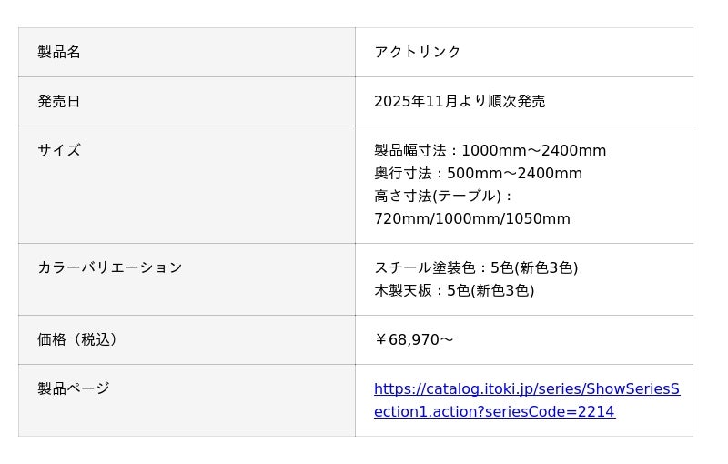 株式会社イトーキ(本社:東京都中央区、代表取締役社長:湊 宏司)は、オフィス全体に心地よい一体感をもたらす執務エリア製品シリーズ「Workscene Colors(ワークシーン カラーズ)」を発表します。本製品シリーズは、コワークやコミュニケーションのエリアと執務エリアを色でつなぎ、オフィス全体を心地よい一体感でつつむ新しいラインアップです。ワークテーブル「アクトリンク」や収納「エスキャビネット」をはじめ、複数の製品をカラー・仕様面で拡充し、2025年11月より順次発売します。