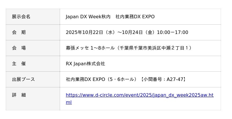 ディサークル株式会社(本社:東京都千代田区/代表取締役社長:内田 晃司)は、2025年10月22日(水)~24日(金)の3日間、幕張メッセで開催される「Japan DX Week 秋」に出展します。