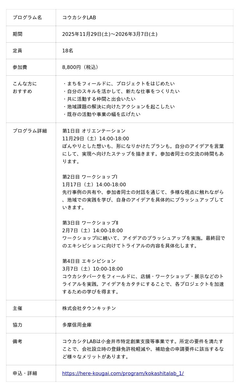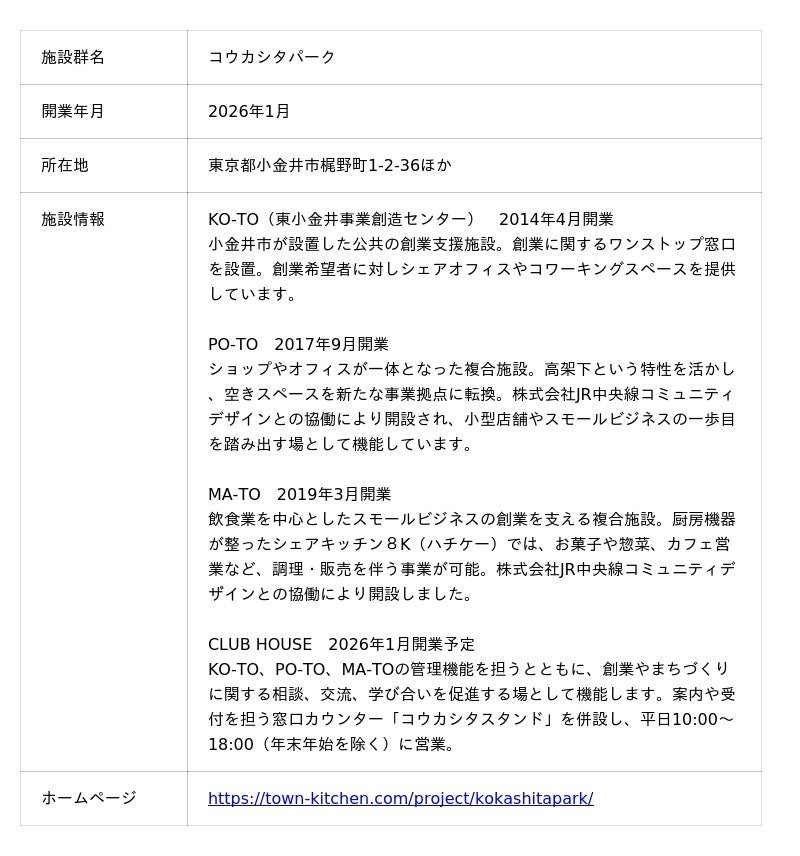東京郊外を中心に創業支援を通じたまちづくりに取り組む株式会社タウンキッチン(本社:東京都小金井市、代表取締役:北池智一郎)は、2026年1月、JR中央線・東小金井駅近くの高架下にて「コウカシタパーク」を始動いたします。