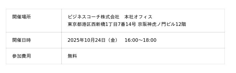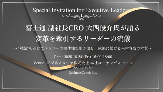 ビジネスコーチ株式会社(本社:東京都港区、代表取締役社長:細川 馨、東証グロース:9562)の子会社であるコーポレートコーチ株式会社(本社:東京都港区、代表取締役社長:森川 駿、以下当社)は、10月24日(金)に、富士通株式会社 副社長CRO 大西俊介氏をお招きし特別セミナーを開催いたします。リーダーとしていかにメンバーの行動変容を支援し、組織のパフォーマンスを最大化してきたのか、 余すことなくお話しいただきます。