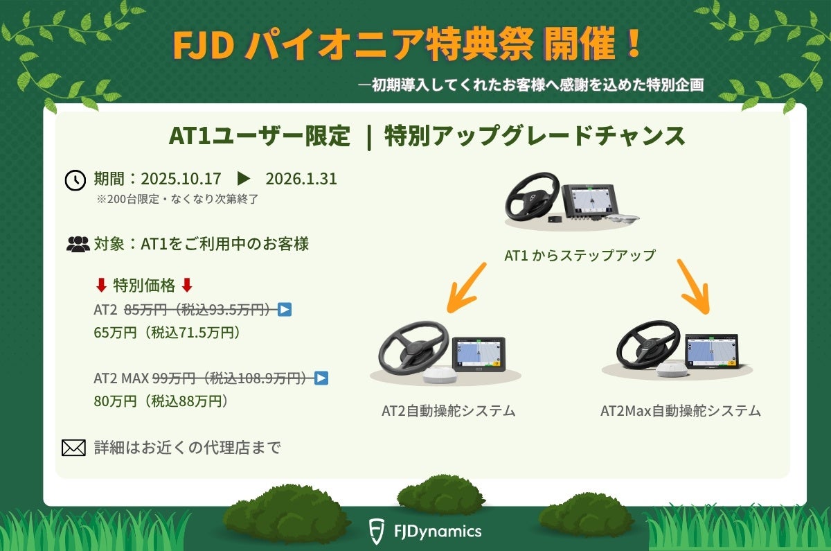 株式会社FAG(エフエイジ―)【東京都港区 代表取締役:木伏裕一( https://www.fagcorp.com/ )】はFJD農機自動操舵システムAT1をご導入済みのお客様に対し感謝の意味を込め最新FJD自動操舵システムAT2/AT2 MAXを特別価格にてご提供する「FJDパイオニア特典祭!!」を実施いたします。200台限定となってますので、お早めにご検討下さい!!