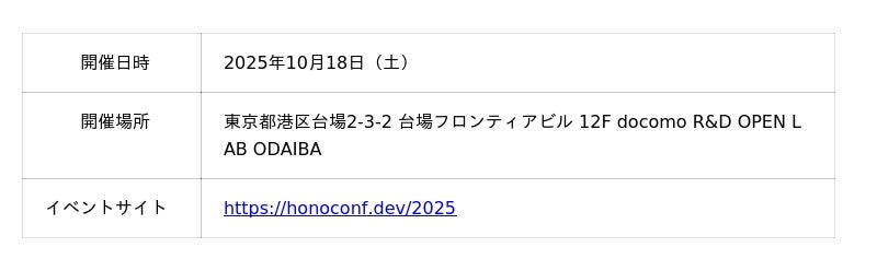 Honoは、Web標準APIに基づいて構築された「小さく、シンプルで、超高速」なWebフレームワークであり、Cloudflare WorkersやDeno、Bun、Node.jsなど、様々な環境で動作する柔軟性が大きな特徴です。当日は、有識者によるさまざまなトークセッションが予定されており、Honoを活用した開発事例など、多彩なトピックが発表される予定です。