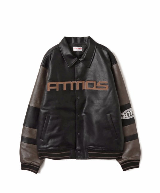 ネイビーとグレーの切り替えが印象的なスタジアムジャケットや、胸に大胆に配された「atmos」のロゴ、クラシックなレターマンジャケットにストリートのエッジを加えていたり、リラックス感のあるシルエットは、都会的でありながらも自由なムードを演出。