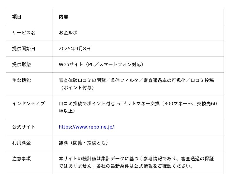 「お金ルポ」は、クレジットカード・カードローン・後払いアプリ等の審査体験口コミと審査通過率データを集約・公開する金融情報サイトです。