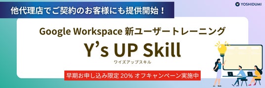 Google Workspace プレミア パートナー(Sell および Service エンゲージメント モデル)である吉積情報株式会社(本社: 東京都千代田区、代表取締役: 秋田 晴通)は、契約代理店を問わず、すべての Google Workspace ユーザーを対象とした新トレーニングサービス「Y's UP Skill(ワイズアップスキル)」の提供を開始することをお知らせします。
