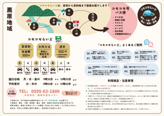 並行して、公共ライドシェアの立ち上げ段階では、制度手続(交通会議・運輸局届出)や実施主体の整理、住民ドライバー体制、予約・配車のオペレーション、広報・周知、効果検証設計などを、名張市および薦原コミュニティバス運営委員会と連携して設計・運営。住宅団地部は定時定路線、分散集落部は住民ドライバーによる公共ライドシェアを組み合わせる再編方針に沿い、エリアとニーズに応じた運行案を検証します。実証では電話予約・週数日の運行・1乗車500円といった運用条件のもと、市が運営委員会に運行委託し、認定講習を受けた住民ドライバーが担う枠組みを整備します。