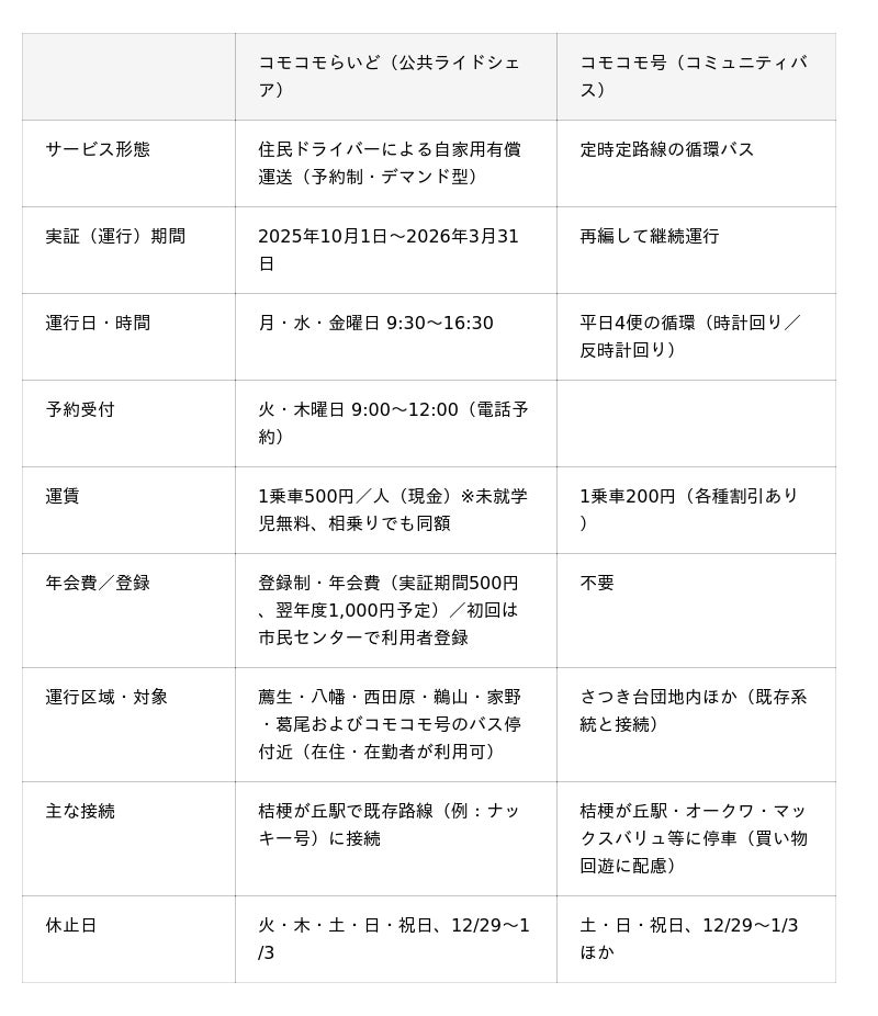 さらに、既存のコミュニティバス「コモコモ号」との役割分担を明確化しつつ、乗継や接続利便の観点も踏まえた再編を段階的に検討し、実証結果を可視化することで本格運行や他地域展開の判断材料を提供。これらのプロセスを通じ、地域の実情に合ったサービス水準の設定と財政持続性の両立をめざします。
