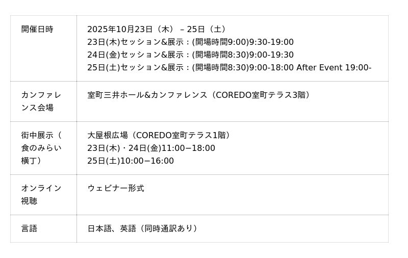 今年はこれまで以上に、多岐にわたるテーマで国内外100名を超える登壇者による約40のセッションに加え、アクションに繋げるInteractive Sessionが登場、さらに展示がさらに充実。最先端の商品や技術展示が行われる30を超える「会場内展示」、未来の食をふんだんに味わうことができる「Future Food Court」、そして昨年に続き街中(今年はメイン会場横の大屋根広場で3日間に渡り開催)でおこわれる街中展示「食のみらい横丁」の3つのゾーンで合計60を超える体験を用意しております。食の進化を実感することができる、最高の場を用意しております。「会場内展示」、「Future Food Court」「食のみらい横丁」揃って、本当に美味しい食が揃っていますので乞うご期待ください。