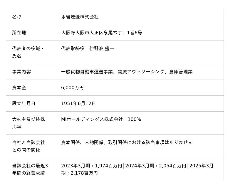 MIホールディングスは、物流事業を中核としたホールディングスカンパニーとして、傘下に水岩運送株式会社、株式会社水岩を擁し、自社車両による輸配送・保管・荷役・流通加工を手掛け、物流ソリューションをワンストップで提供することで、関西大手の流通加工業者として、百貨店納品代行事業をはじめアパレルメーカー・専門店・量販店などの多くの法人顧客を有しております。