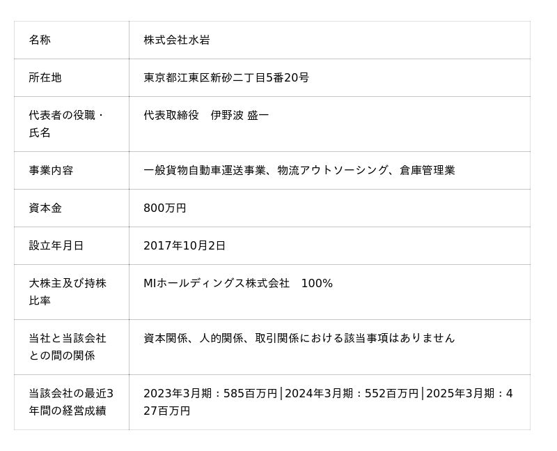 プラス ロジスティクス株式会社(本社:東京都豊島区、代表取締役社長:若佐 照夫、以下当社)は、 2025年9月19日開催の取締役会において、以下のとおり、MIホールディングス株式会社(本社:東京都江東区、代表取締役社長:伊野波 盛朗、以下MIホールディングス)の株式を82.8%取得し、子会社化することについて決議いたしましたので、お知らせいたします。