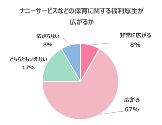 この度、法人向けコース導入中の企業を対象にアンケートを実施。約70%の企業が、ナニーサービスの導入が「育児と仕事の両立支援に非常に効果があった・効果があった」と回答しました。また、75%の企業が「ナニーサービスなどの保育に関する福利厚生が非常に広がる・広がる」と回答し、働きやすい環境整備への関心の高さが見られました(※2)。