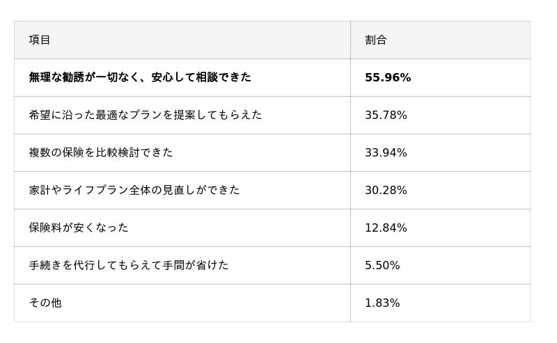 - 満足した理由の1位は「無理な勧誘が一切なく、安心して相談できた」(55.96%)であり、事前の不安が払拭されたことがうかがえる。