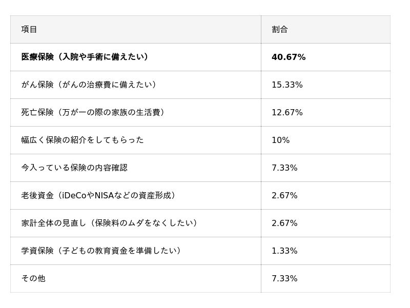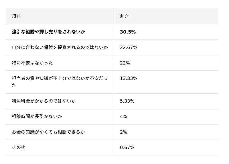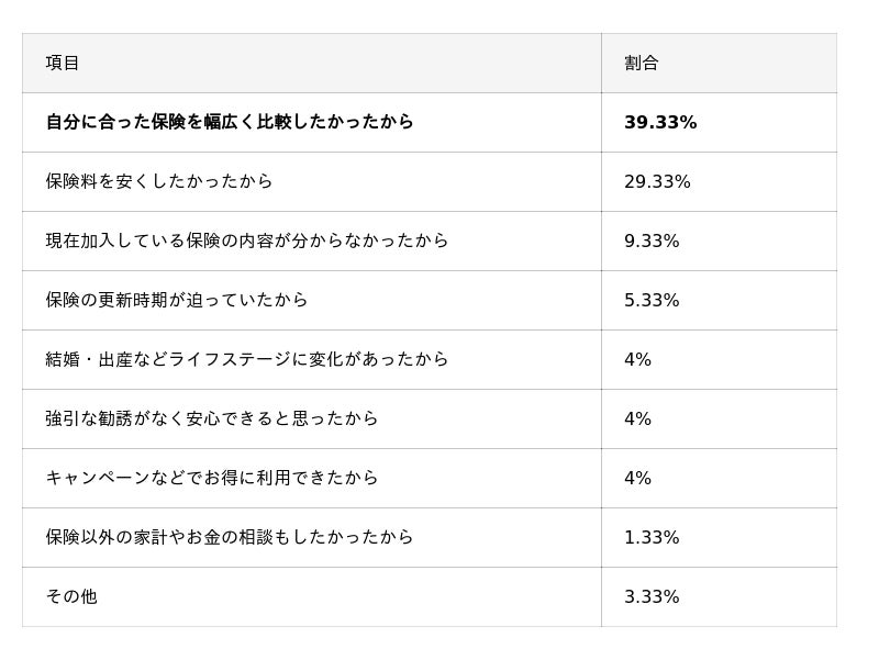 - 利用のきっかけとして最も多かったのは「自分に合った保険を幅広く比較したかったから」(39.33%)。一方で、利用前の不安点では「強引な勧誘や押し売りをされないか」が30.5%でトップであり、勧誘に対する警戒心が見られた。