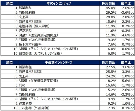 - インセンティブ報酬の評価指標では、株主価値を直接反映するTSR(株主総利回り)の採用が拡大。加えて、E(環境)指標「GHG排出量関連」やS(社会)指標「従業員満足度関連」など定量化しやすい将来財務指標(非財務指標)の採用も目立つ。