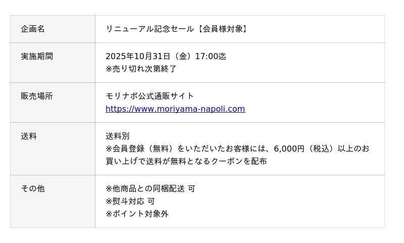 今回のリニューアルでは、ご購入金額に応じて特典がグレードアップする会員ステージ制を新たに導入したほか、お届け希望日の指定機能を拡充するなど、お客様の利便性を大幅にアップさせました。さらに、人気ピザなどを特別価格でお求めいただける期間限定のお得なセールやセットも販売。 今後も皆さまに愛される通販サイトを目指し、サービスの向上に努めてまいります。新しくなったモリナポ公式通販サイトでのお買い物をぜひお楽しみください。