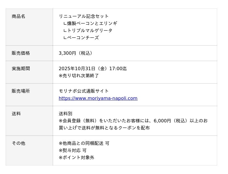 冷凍ピザ等の製造・販売を手掛ける株式会社森山ナポリ(石川県金沢市)が展開するブランド「モリナポ」は、公式通販サイトを2025年10月16日(木)にリニューアルオープンいたしました。