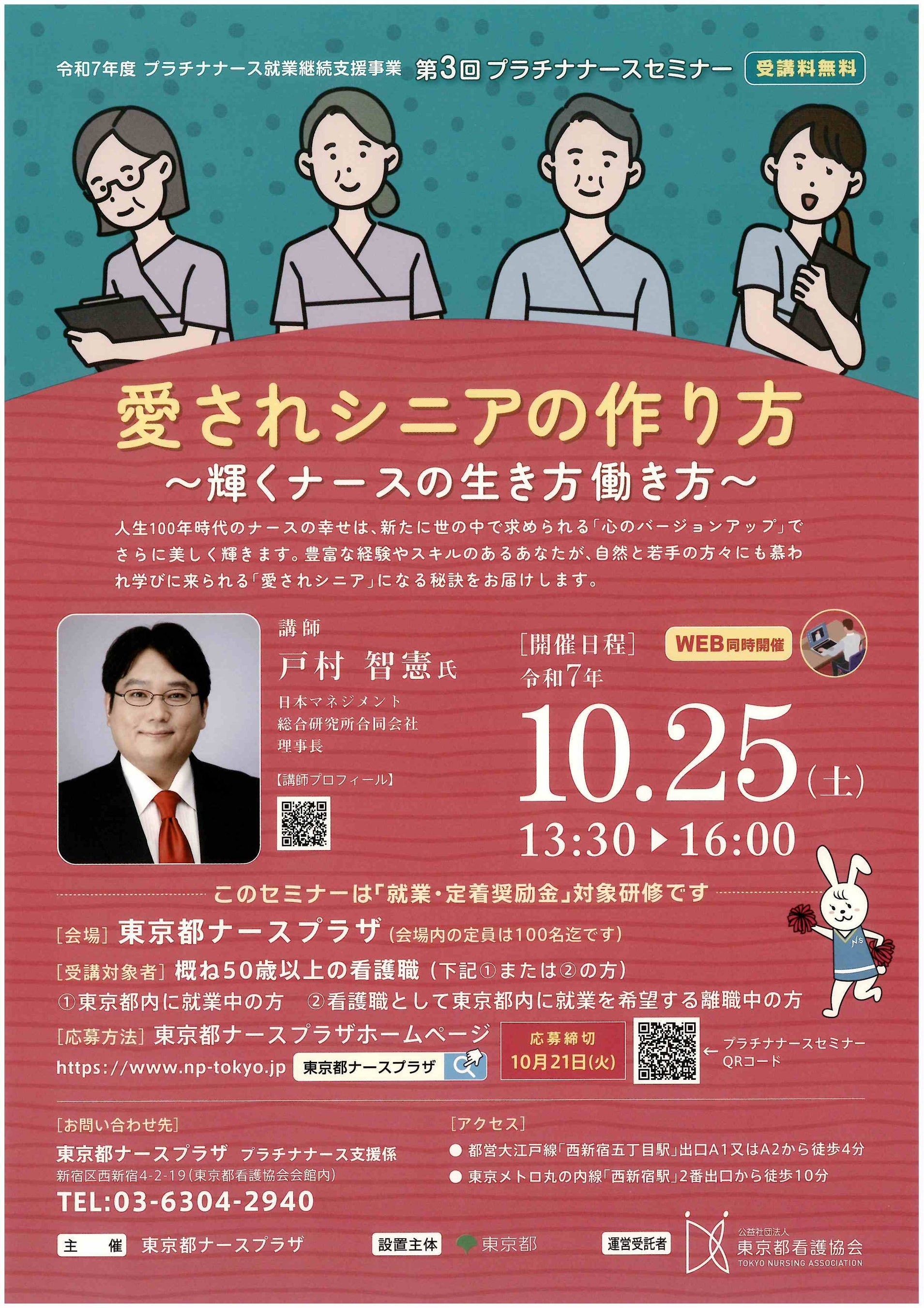 令和7年度 プラチナナース就業支援事業 第3回プラチナナースセミナー(ご主催者さま名称: 東京都ナースプラザ(公益社団法人東京都看護協会内))2025年(令和7年)10月25日(土)13:30~16:00「愛されシニアの作り方: 輝くナースの生き方働き方」(講師:戸村智憲)への出講ご依頼・登壇のご縁