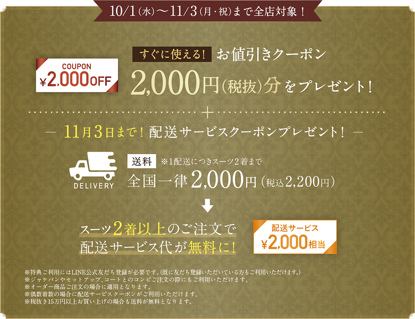 【新店オープン記念】オーダースーツ2着コンビフェア!全店舗で開催中!
