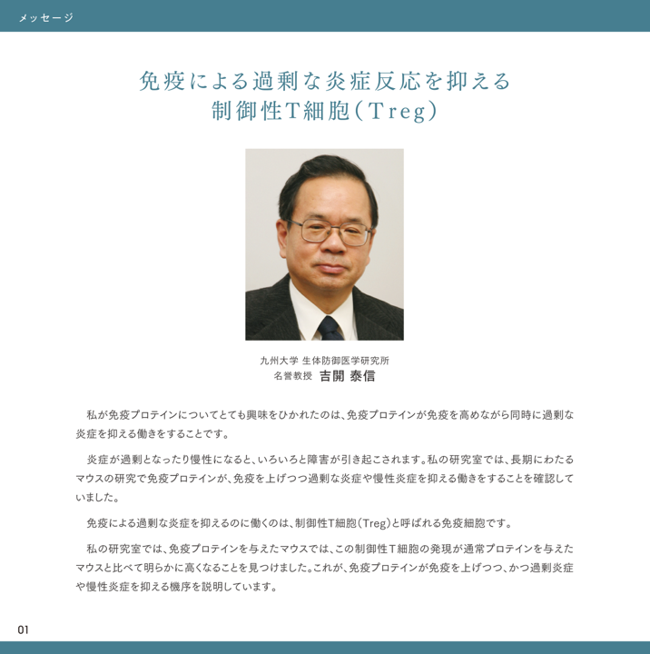 吉開名誉教授の研究室におけるマウスを用いた基礎研究では、免疫プロテインという食品素材と免疫バランスに関するデータが確認されています。その研究において、免疫プロテインを与えたマウスは、通常プロテインを与えたマウスと比較して、制御性T細胞(Treg)の発現が高まるという結果が報告されました。