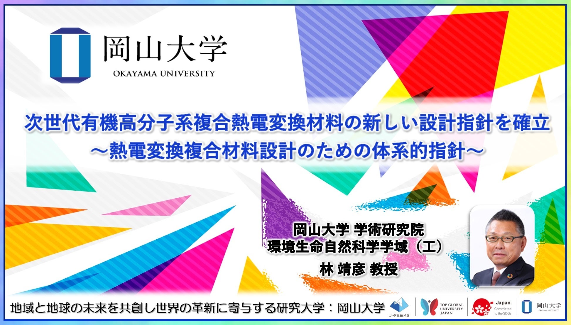 国立大学法人岡山大学(本部:岡山市北区、学長:那須保友)の学術研究院環境生命自然科学学域(工)の林靖彦教授は、エチオピアのBahir Dar University、中国のSouthern University of Science and Technology、Jianghan University、シンガポールのAgency for Science、 Technology and Research (A*STAR)、National University of Singapore、Nanyang Technological Universityの研究者等と共同で、有機高分子(ポリマー)系複合熱電変換材料の性能向上に関する体系的レビュー論文を発表しました。この研究成果は、2025年9月5日に英国王立化学会(Royal Society of Chemistry)の学術雑誌「Journal of Materials Chemistry A」に掲載(First published)されました。