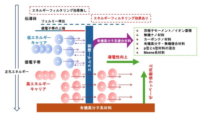 本論文では、有機高分子複合材料中で異なる材料が接する界面のエネルギー障壁で、低エネルギーキャリアを遮断し、高エネルギーキャリアのみを透過させ、この結果、流れるキャリアは平均して高いエネルギーを持つ「エネルギーフィルタリング効果」を整理し、四つの複合材料カテゴリごとに熱電変換特性を向上させる設計指針を網羅しました。