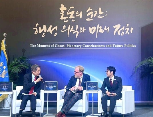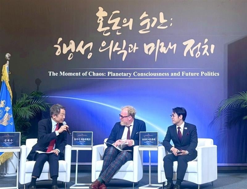 会議は、キム・ウォンス氏(慶熙大学ミウォン平和研究所高級顧問、未来文明院長)の司会のもと、ほかにグロ・ハーレム・ブルントラント氏(ノルウェー初の女性首相、The Elders 創設メンバー)、ポール・シュリバスタワ氏(ローマクラブ共同代表)、アリスター・ファーニー氏(The Elders 最高経営責任者)、トーマス・セドラチェク氏(ヴァーツラフ・ハヴェル図書館 館長)、ジョルジー・サボ氏(ユビキタス大学 大学院長、ラズロ新パラダイム研究所元事務局長)らも登壇。マーヘル・ナッサー氏(国連事務次長補)およびミリアン・ヴィレラ氏(地球憲章国際本部(Earth Charter International)事務局長)からはビデオメッセージが寄せられました。
