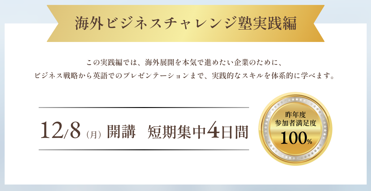 海外展開を本気で進めたい企業のために、Canvaセミナーで学んだノウハウを活かし、海外ビジネス・チャレンジ塾で海外戦略策定資料を作成。ビジネス戦略から英語でのプレゼンテーションまで、実践的なスキルを体系的に学べる講座を同時募集します。