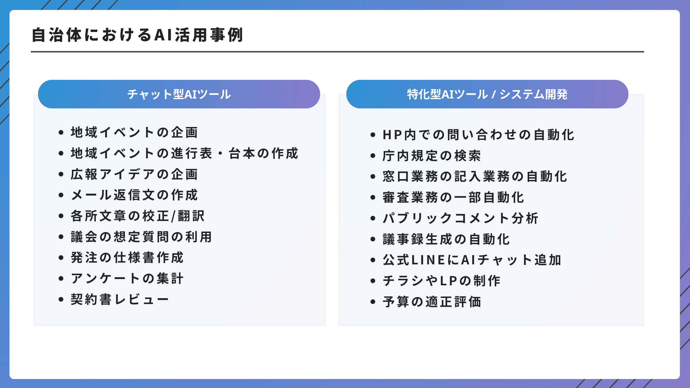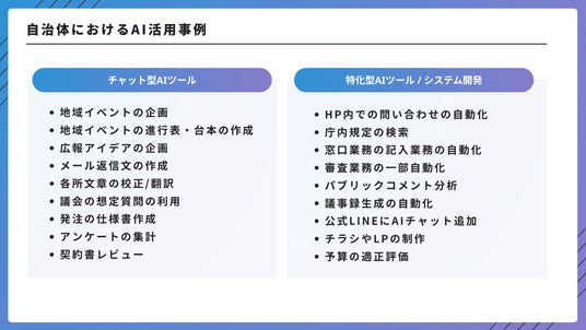 ツールの導入から組織全体での活用方法、AIシステム開発に至るまで、伴走型でサポートしており、「自治体に最も理解のあるAI事業者」として高い評価を得ています。