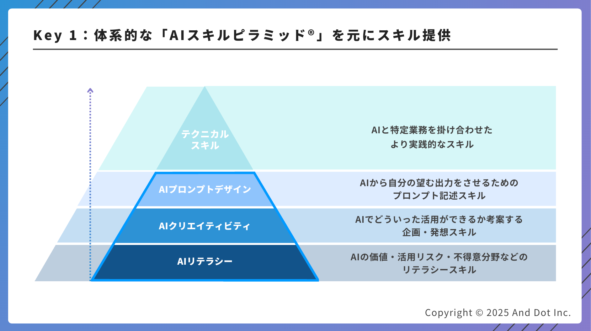 合計150自治体(18県、122市、20町)以上に実施をしている、体系化された生成AI活用支援プログラム。AI活用に必要不可欠な三大スキルをベースに進めます。