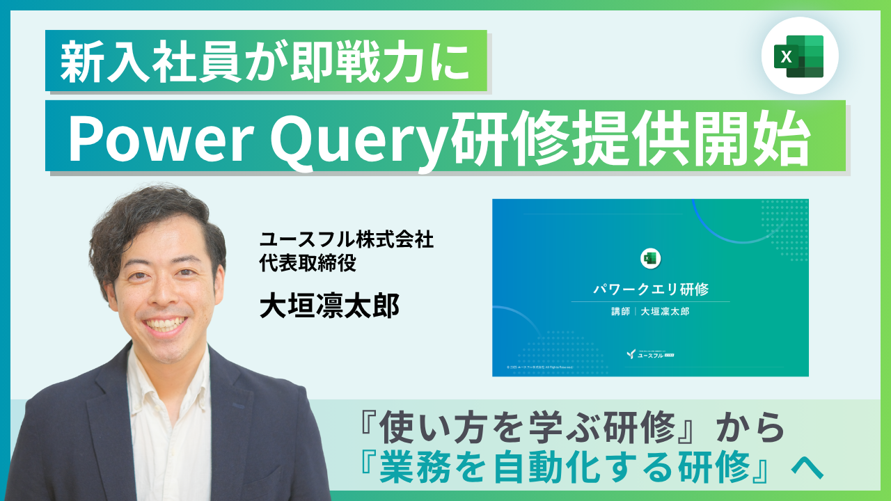 ユースフル株式会社(本社:東京都千代田区、代表取締役:大垣 凛太郎)は本日、日本企業の喫緊の課題であるDX人材不足に対し、新入社員研修というアプローチから解決を目指す新プログラム「Power Query研修」の提供を開始したことを発表します。従来一般的だったExcel関数の学習に留まらず、Excel標準搭載のローコードツール「Power Query」を用いてデータ自動化までを短時間で体験。キャリアの初期段階で「業務を自ら効率化する」成功体験を提供し、現場主導のDX推進を担う次世代人材の育成を目的としています。