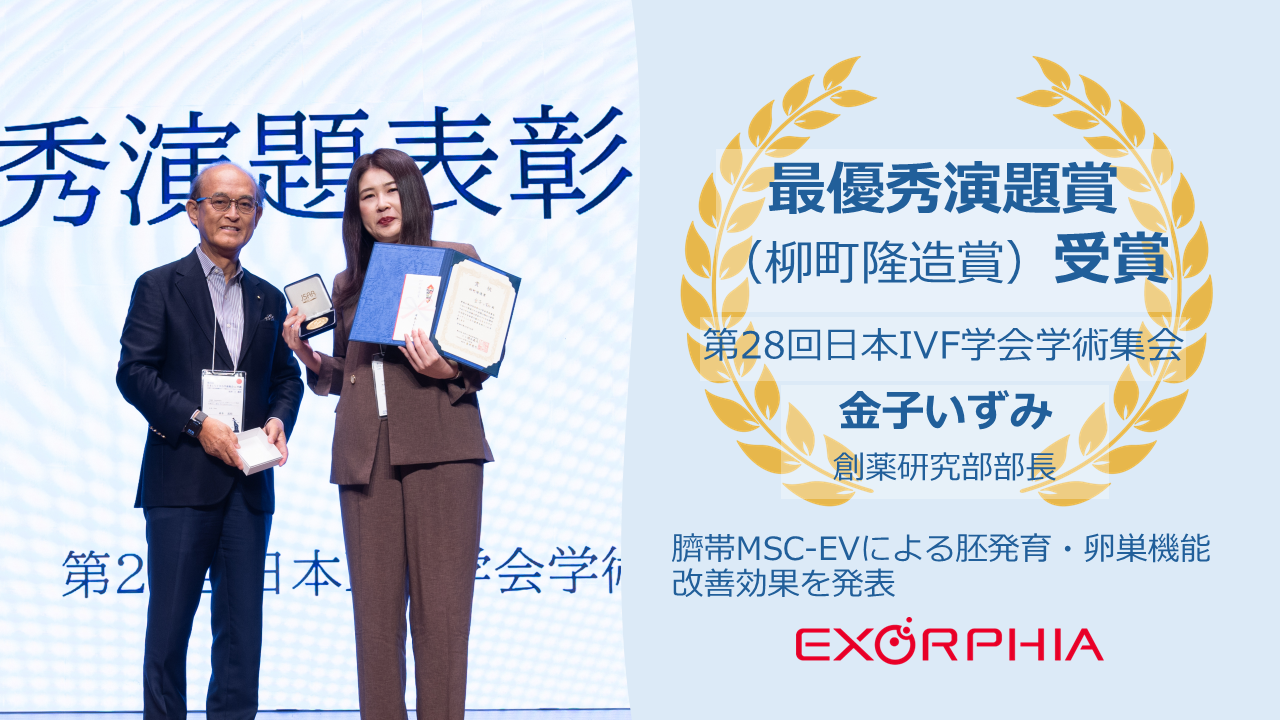 2025年10月、株式会社EXORPHIA(本社:東京都、代表取締役CEO:口石幸治)は、第28回日本IVF学会学術集会(JSAR Annual Meeting 2025)において、当社創薬研究部 部長・金子いずみの発表が「最優秀演題賞(柳町隆造賞)」を受賞したことをお知らせいたします。本賞は、生殖補助医療(ART)の進歩に寄与する優れた研究を行った会員に授与されるものです。