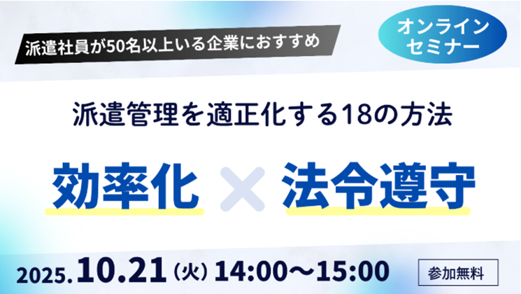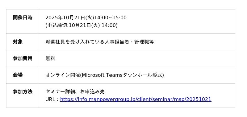 総合人材サービスのマンパワーグループ株式会社(本社・東京都港区、代表取締役社長:池田 匡弥、以下マンパワーグループ)は、10月21日(火)14:00∼15:00に、派遣社員を受け入れている企業の責任者・人事担当者を対象とした無料オンラインセミナー「派遣管理を適正化する18の方法」を開催します。派遣社員の依頼から契約締結・管理までのプロセスを整理し、法令遵守と安定運用を実現するための実践的な手法を解説します。