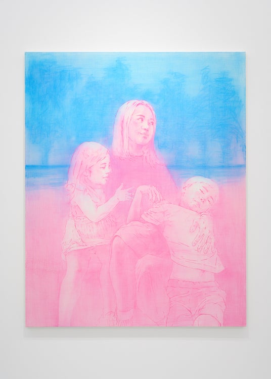 何気ない家族の写真がもとになっていますが、その構図には「聖母子像」のイメージが見立てられています。また、撮影者が舘鼻本人であることを考慮すると、被写体となっている三人の家族の対面には、撮影者であり作者自身の存在が暗示されており、それもまた絵画の構成要素のひとつとなっています。