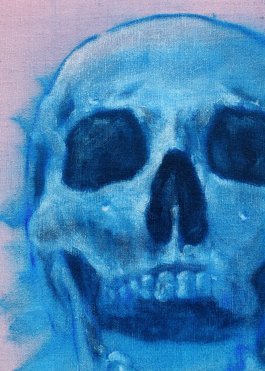 その延長線上に位置づけられる本作でも、描かれている頭蓋骨は博物館で見られるような他者のものではなく、作家自身の頭蓋骨が描かれています。