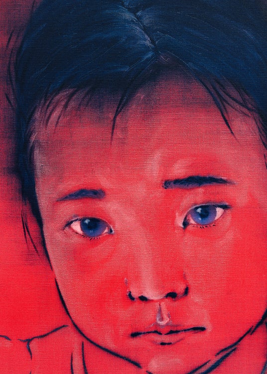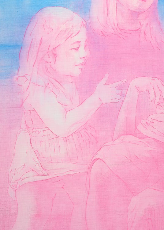 本展では、舘鼻則孝によって描かれた子供たちを被写体とする作品が複数点公開されています。これらの作品は、日常の何気ないひとコマを作家独自の視点で切り取り、そのイメージをもとに構築されています。舘鼻は、日常を記録する写真の中には、写真作品としては選ばれないような瞬間であっても、絵画のモチーフとして見ると強い魅力を持つものがあると語っています。