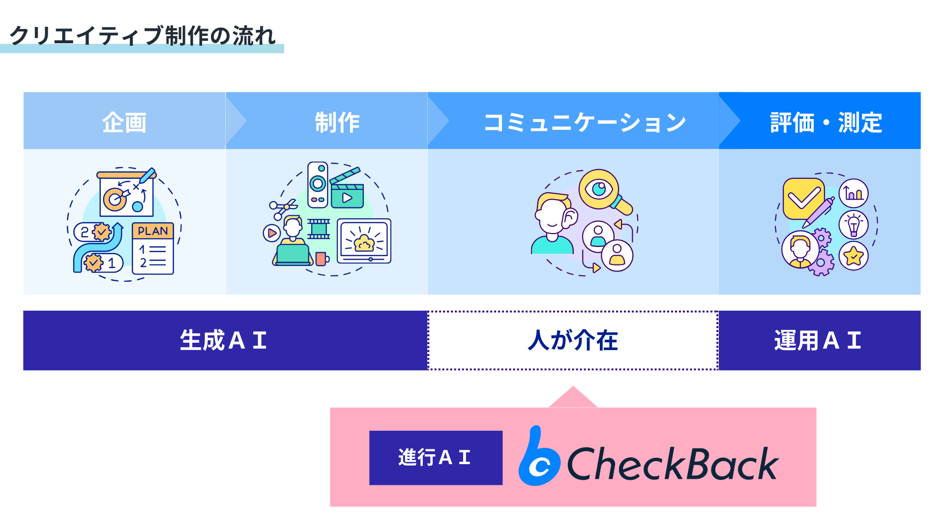 クリエイティブ制作は「1.企画」→「2.制作」→「3.コミュニケーション」→「4.評価・計測」というサイクルで進行します。近年では、生成AIによって「1.企画」や「2.制作」のスピードは飛躍的に向上し、「4.評価・計測」の自動化も進んでいます。