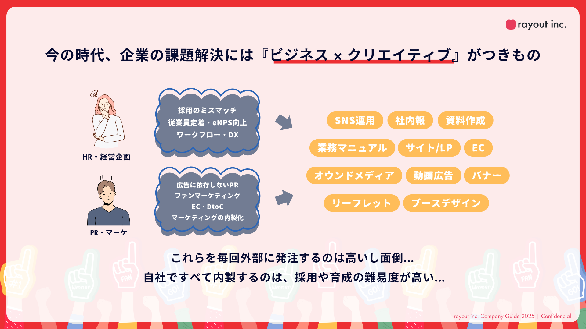 そこでrayoutは、制作やPR領域のエグゼキューション(遂行・推進)に強みを持つ「クリエイティブPM」をPMO(プロジェクトマネジメントオフィス)の形で提供しています。これにより、企業は定例会議への参加からプロジェクトの実施までをワンストップで依頼でき、不必要な下請け構造から生じるPMコストをなくすことができます。