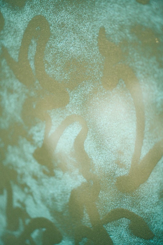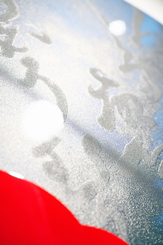 本作には、富士フイルムが開発した「高輝度メタリックインクジェット技術」を採用しています。本技術は、富士フイルムが写真用フィルム分野で培った独自の粒子配向技術を応用し、粒子の正確な配列をインクジェット印刷で実現しました。そのような革新的な技術により、極めて高輝度な金属調表現を可能とするだけでなく、グラデーションや質感の制御により多様な表情を生み出しています。本作では、このメタリックインクを極限まで薄く載せた儚い光沢感から、濃厚なインク量で金属調を印象的に表現する部分など、インクジェットの打滴量を制御することで従来の印刷にはない立体的な表現を実現しています。