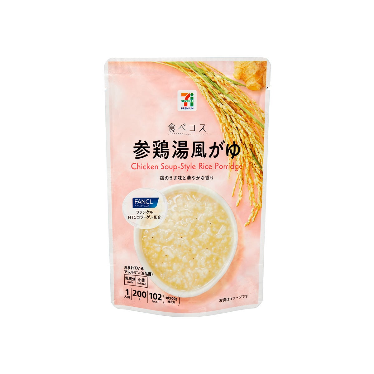 ■商品特長 : 鶏のうま味と、香味野菜や香味油の華やかな香りを感じる、参鶏湯風のおかゆです。吸収されやすいサイズまで分解したファンケルHTCコラーゲンを配合しています。