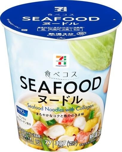 ■商品特長 : ファンケルHTCコラーゲンを配合したシーフード味のスープにしなやかな食感の麺を合わせました。キャベツ、スクランブルエッグ、かに風味かまぼこ、いか、ねぎの具材が彩り良くカップに広がります。