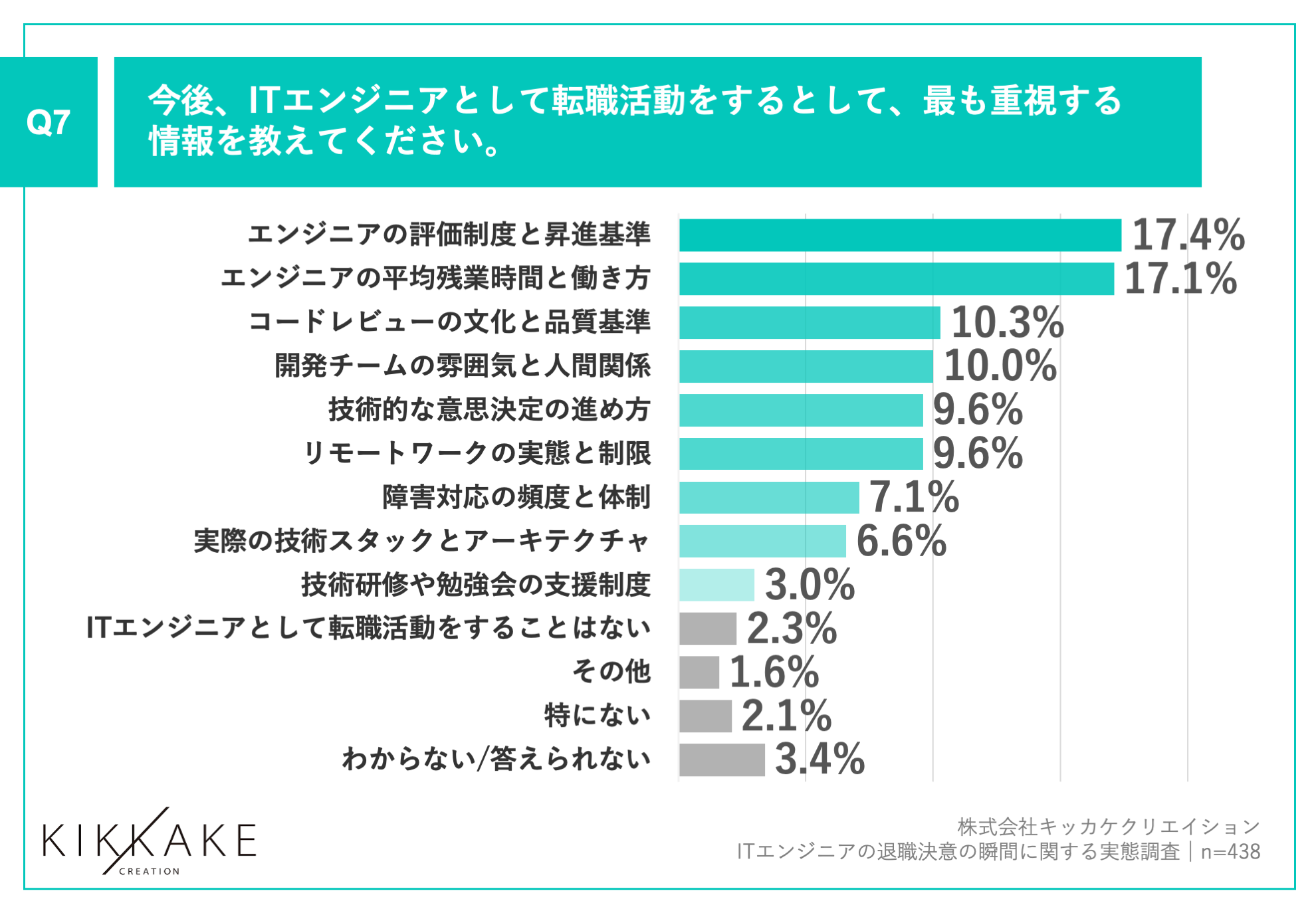 「Q7.今後、ITエンジニアとして転職活動をするとして、最も重視する情報を教えてください。」(n=438)と質問したところ、「エンジニアの評価制度と昇進基準」が17.3%、「エンジニアの平均残業時間と働き方」が17.1%、「コードレビューの文化と品質基準」が10.3%という回答となりました。