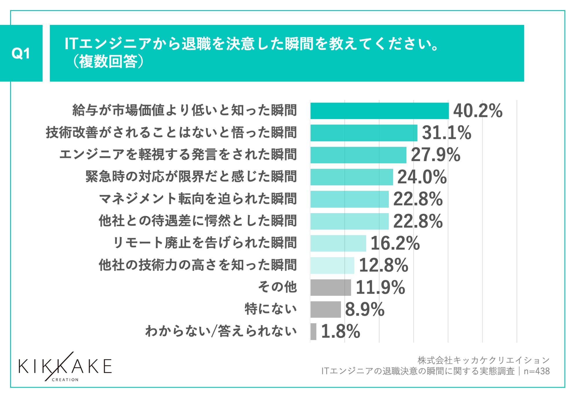 「Q1.ITエンジニアから退職を決意した瞬間を教えてください。(複数回答)」(n=438)と質問したところ、「給与が市場価値より低いと知った瞬間」が40.2%、「技術改善がされることはないと悟った瞬間」が31.1%、「エンジニアを軽視する発言をされた瞬間」が27.9%という回答となりました。